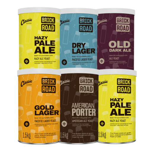 This Intro Pack contains two Hazy Pale Ales and one each of American Porter, Gold Lager, Old Dark Ale and Dry Lager. Brick Road Classic beer kits are designed specifically for New Zealand and Australian brewers. Under the lid of each Classic kit is a specific yeast to suit the style of beer and detailed brewing instructions. On the can there are recipe options, alcohol options, dry hop suggestions and alternate yeast options.